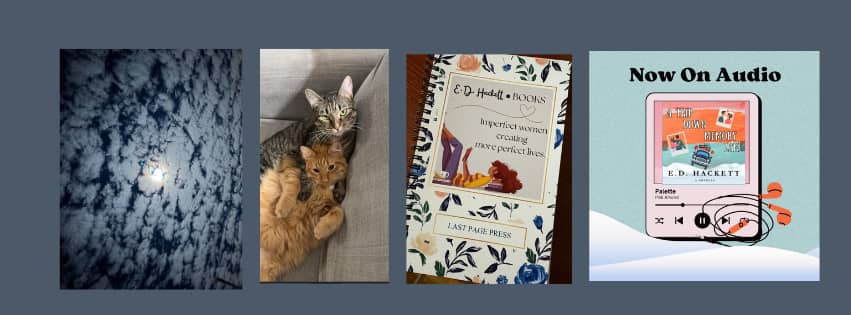 Hello Reader, Welcome to Edy's Writing World! Take a peek into my chaotic December, but don't worry, I have plenty of bookish things in store for you today! Make sure you read until the end π Writing CornerEmbracing Island Life, the third and final installment of The Block Island Saga is almost done. I think I've reread and reworked this novel from start to finish at least seven times. Let's just say my eyeballs are struggling to focus and I am beginning to question my life choices....just kidding (kind of). But really, it's been a wild ride. This series has been following me since 2019. I've published books 1 and 2 twice and am now ready to get Jackie's story out there. It will be available just in time for the summer. I got a brand new notebook, which I'm obsessed with, and I've been jotting down all the book ideas I've had over the past few years. I think the hardest thing when starting a new novel is figuring out which story idea is worth the hundreds of hours to perfect. And what if I pick the wrong one? There is so much pressure. I do have a few ideas percolating, but first I am going to take a break from all things books and just experience life. Maybe I'll go visit a place I've never been, or eat a food I've never eaten, or do an activity that is totally out of character for me (for me, being the scaredy-cat I am, ax-throwing would suffice for this category). βIf you have any fun ideas or places to visit please let me know!β My mantra for my time away will be "It is not the destination where you end up but the mishaps and memories you create along the way!" Penelope Riley Writing is cathartic and reading inspires, but feeling and seeing and touching are necessary to pull off a believable story. So mark your calendars for May 15th. Jackie's story is coming into the world. And to celebrate, I am going to Block Island. Gratitude CornerThis has been a crazy two weeks. Sometimes I wake up and I have no idea what day it is. I figure it's just the Holiday Blitz, but I'm tired! I haven't been able to go for walks because the sun sets so early and the temperature has been frigid, but I have been diving into some new books and LOTS of baking experiments. My new favorite show is the Holiday Baking Championship, and I have been inspired on more than one occasion. I even boiled myself some homemade evaporated milk the other day because we were out. So what was I grateful for? First of all, that sky. It looked like craquelin, or at least how I imagine craquelin looks. If you are unfamiliar, like I was, that refers to the topping on cream puffs (haha, can you tell I've been watching baking shows?). It was gorgeous, and after I missed the Northern Lights I was so happy to get outside and look up. These two rascals are my cats. The one on top is Julia aka Bubba Chunks. The one below is Curtis J or Chester or Charlie. We adopted them as a mother-son duo (and yes, that giant orange blob is the baby), and it warmed my heart to see them spooning. We wonder who Curtis's dad is, and we're starting to think maybe a Maine Coone. Bubba was a teenage mom, so they're more like brother and sister. The next is my notebook. Isn't it so beautiful? I'm a bargain hunter and ordered this on Black Friday. I just love it. It makes me happy just looking at it. And the last is my newest audiobook. I LOVE it! It's such a fun, sweet, second chance romance and it is dedicated to all the 'whatifs' in life. Reading CornerAh, the moment you've all been waiting for! I have a few announcements and I hope you take advantage of them! First off, I am participating in a Women's Fiction paperback giveaway. If you live outside the U.S. and you are selected, you will receive digital copies. If you love discovering new women's fiction authors, don't miss this giveaway! Sign up for author newsletters to enterβone lucky reader will walk away with a full collection for their home library! This is what you do. Click on the image below and put in your email. That puts you in the drawing. Then, for additional entries, you can browse each author's giveaway pages and sign up for whichever authors you are most interested in (it could be all, some, or just one). It's totally up to you, as we don't want you spammed with a million emails. The giveaway winner will be selected on January 5th! Good luck! The next fun announcement is related to free and discouted books! Smashwords is having their end of the year sale and MANY authors have discounted all their books or marked them all as free. βI am participating and ALL my books are currently zero dollars and zero cents. Yep, you heard that right. You can download my entire collection, which currently stands at seven novels and one novella, for nothing. So get moving and check out the Smashwords site! If you are looking for additional free romance reads, I have something for you! You never know, you may find your next favorite author. Happy reading! I hope you have a great end of the year and find lots of amazing books to read! Keep Reading, Edy